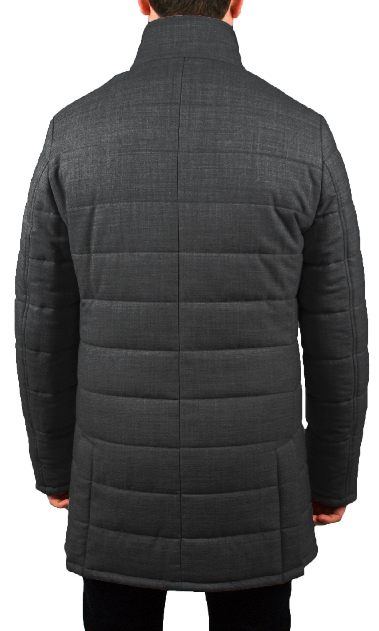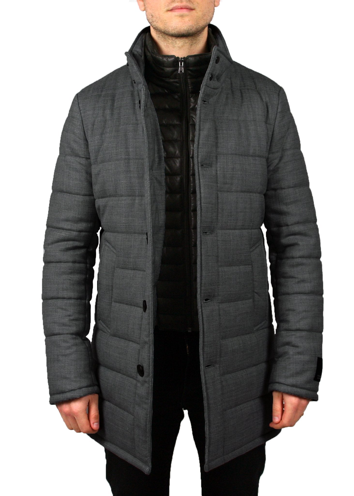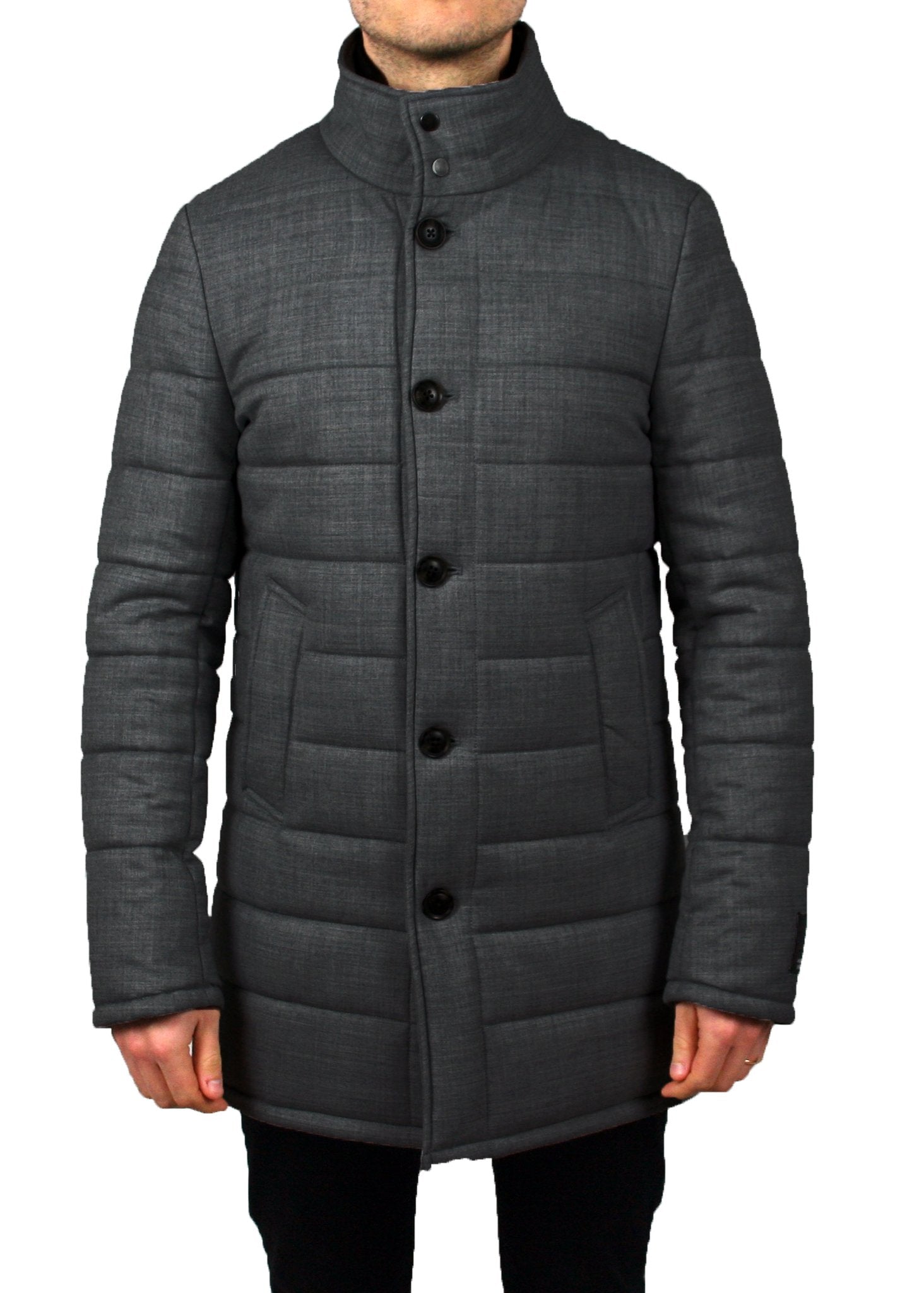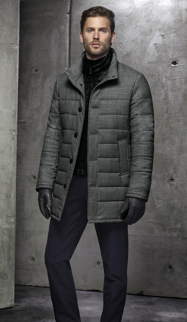 Our Mountain quilted overcoat is our warmest coat yet. It features a removable placket.